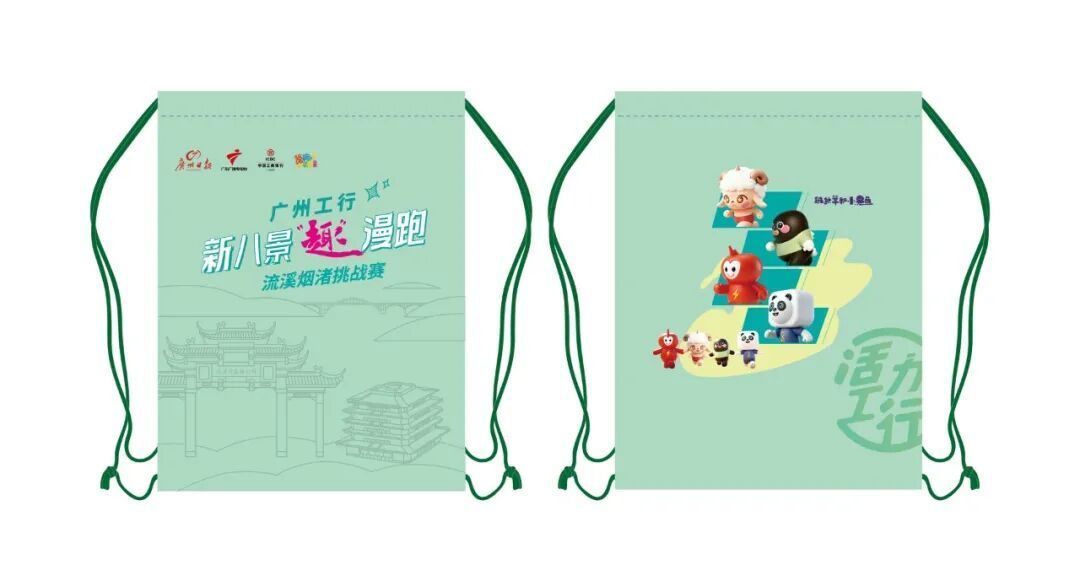 活动赠送参与者绿色定制抽绳袋,正面以醒目亮眼的红色点缀绿色背景,并融合广州日报等标识,下方辅以流溪河国家森林公园牌坊、国家版本馆广州分馆、彩虹桥等线描图,彰显从化流溪文化印记。袋子背面以《斑纹羊和小黑鱼》动漫角色为主视觉,底部配有“活力工行”标志,整体风格温馨可爱。深绿色抽绳与袋子颜色呼应,轻便实用。