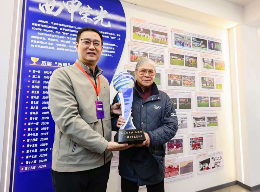 三水赛区首场比赛当日,霍英东集团主席霍震霆亲临云秀山体育场,传承其父霍英东先生创办省港杯的初心,为粤港澳体育交流助力。1984年,云秀山体育场完成升级改造重新开放。当时,亚足联副会长霍英东先生应邀担任剪彩主礼嘉宾,并亲自为落成庆典球赛开球,一同出席的,还有霍英东之子霍震霆。而2025年7月4日晚,健力宝杯第十九届佛山“西甲”足球联赛开幕,霍英东先生之孙霍启山先生现身云秀山体育场,组委会向其送上41年前霍英东先生开球的油画,见证三水足球百年传承。