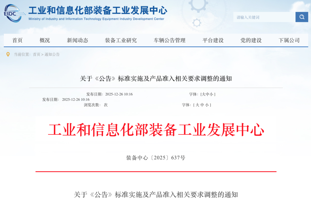 12月26日,工业和信息化部装备工业发展中心发布《关于〈公告〉标准实施及产品准入相关要求调整的通知》。其中,在产品准入申报要求调整中提及,从2026年3月的第404批公告开始,乘用车产品在申请准入时,必须在“结构图纸”中提供能体现前排驾驶室整体布置和内部结构的整体照片。