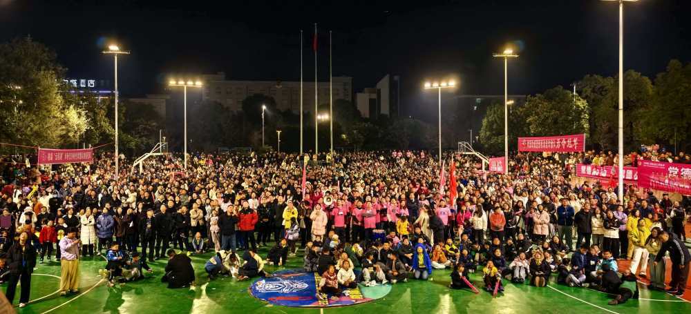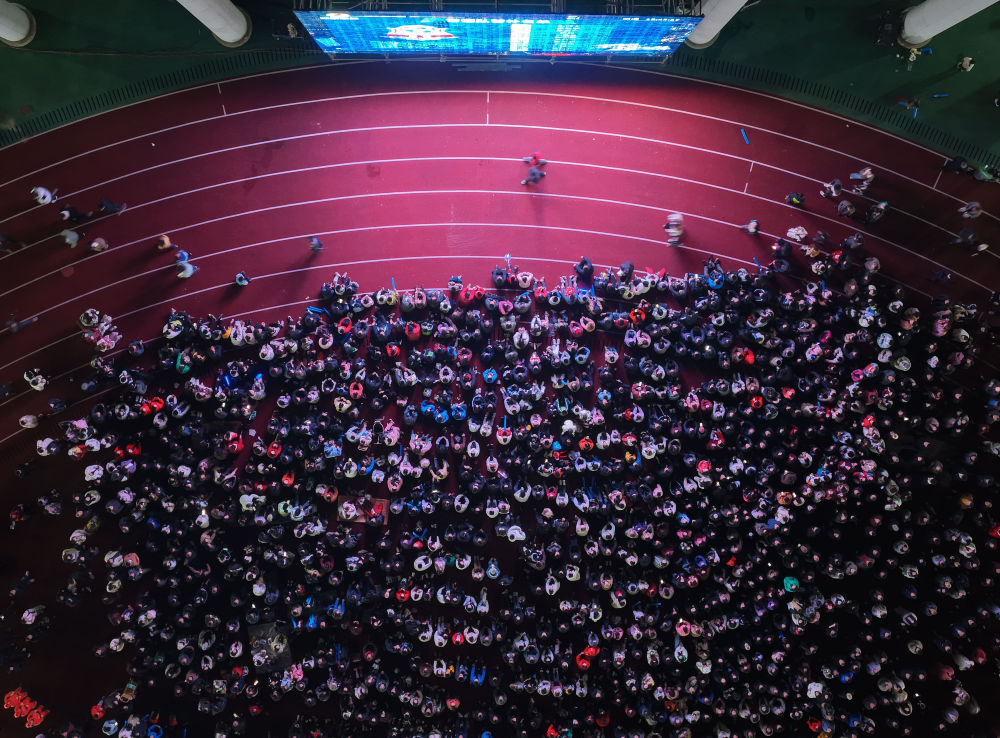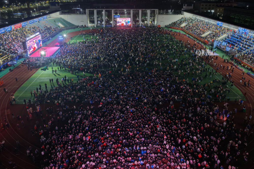 ↑ 球迷在湖南永州道县文体中心观看比赛直播(无人机照片)。 新华社发(蒋克青摄)