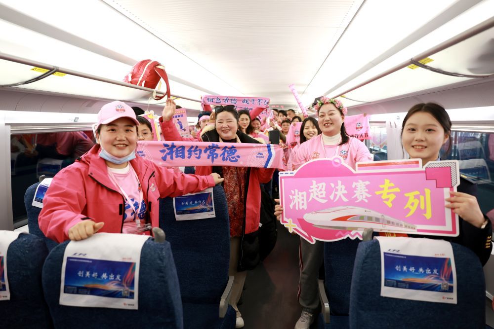 ↑ 球迷从常德火车站乘坐“湘超”专列前往长沙市贺龙体育场观赛。 新华社发(蔡文龙 摄)