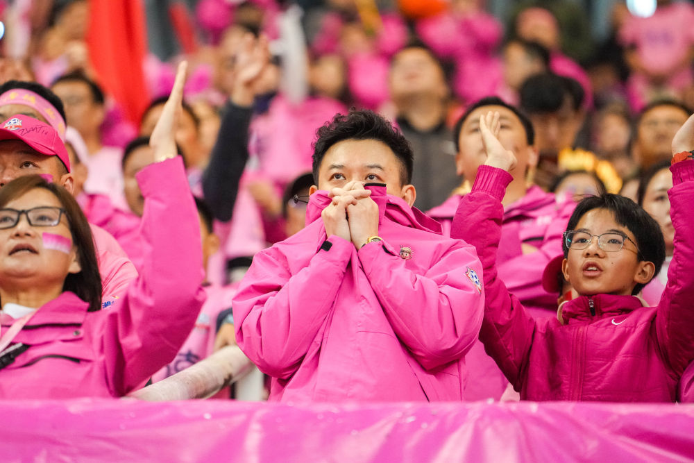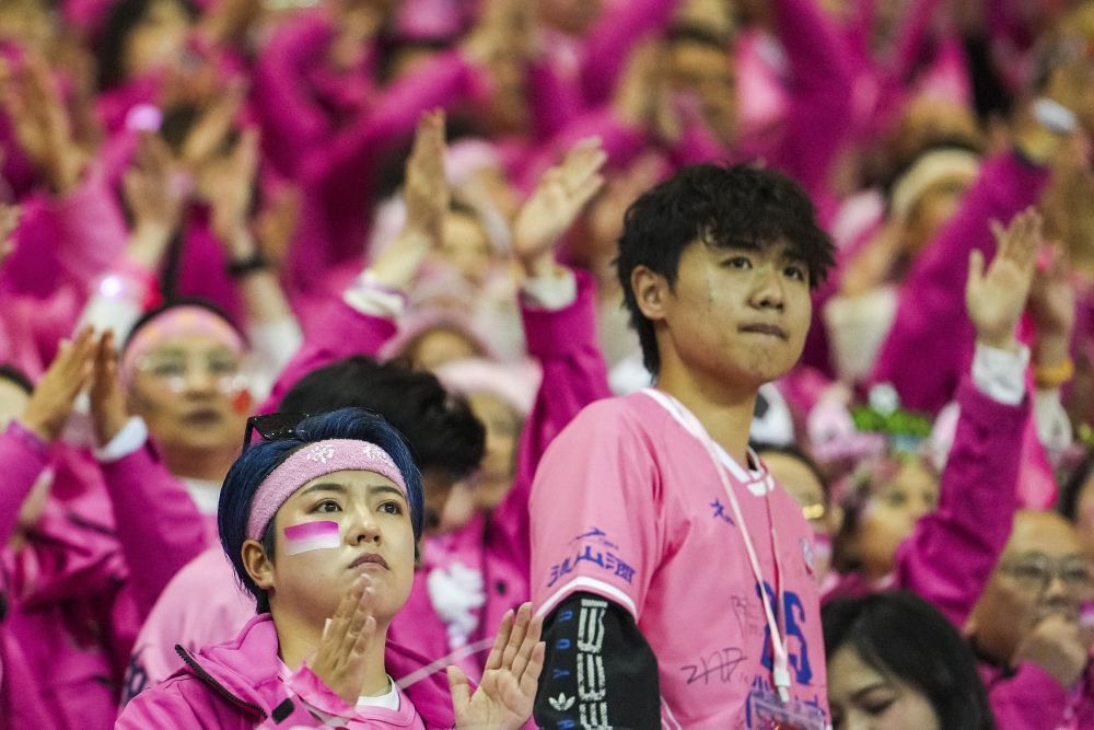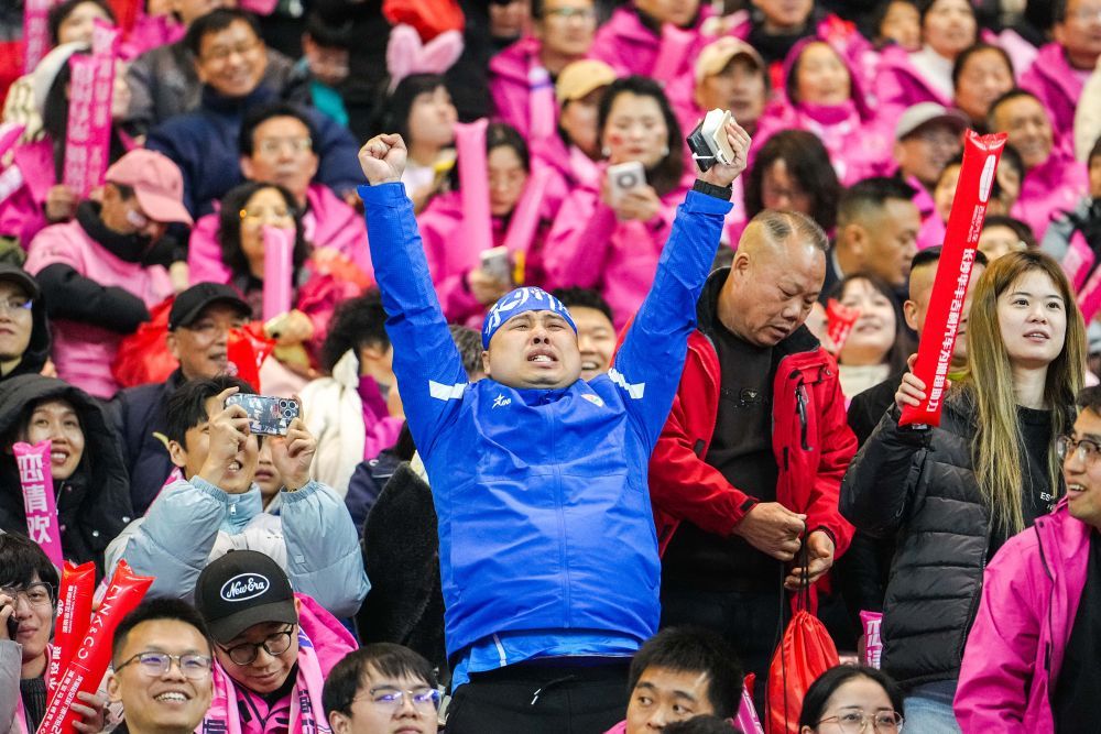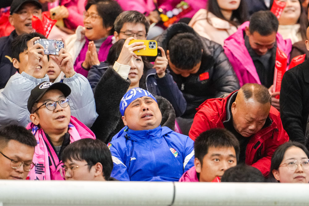 ↑ 永州队球迷(中)在永州队赢得比赛后喜极而泣。 新华社记者 陈思汗 摄