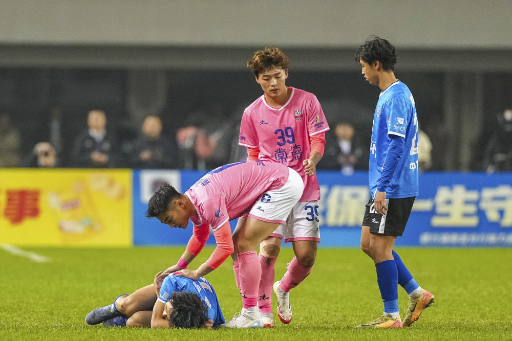 ↑ 永州队球员高响(左一)在比赛中摔倒后,常德队球员朱博文(左二)上前安慰。 新华社记者 陈思汗 摄