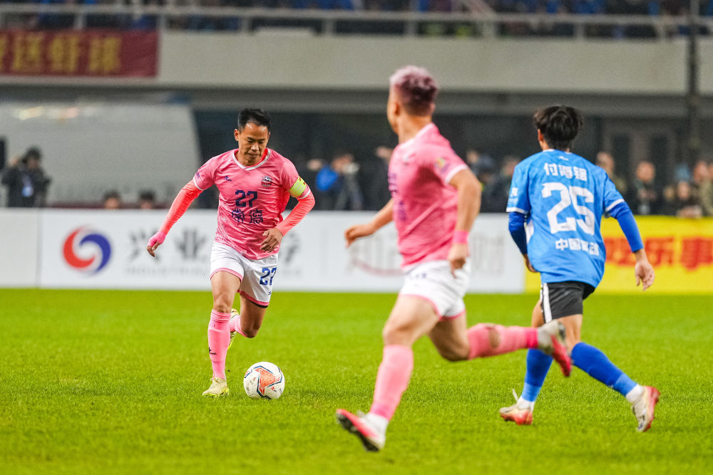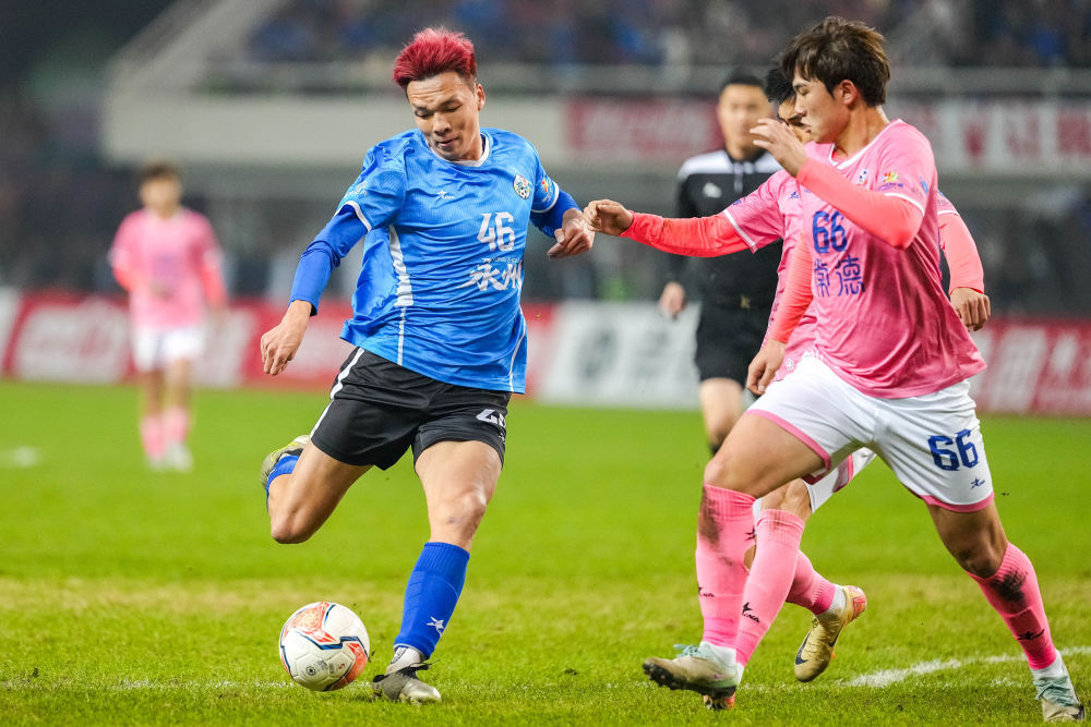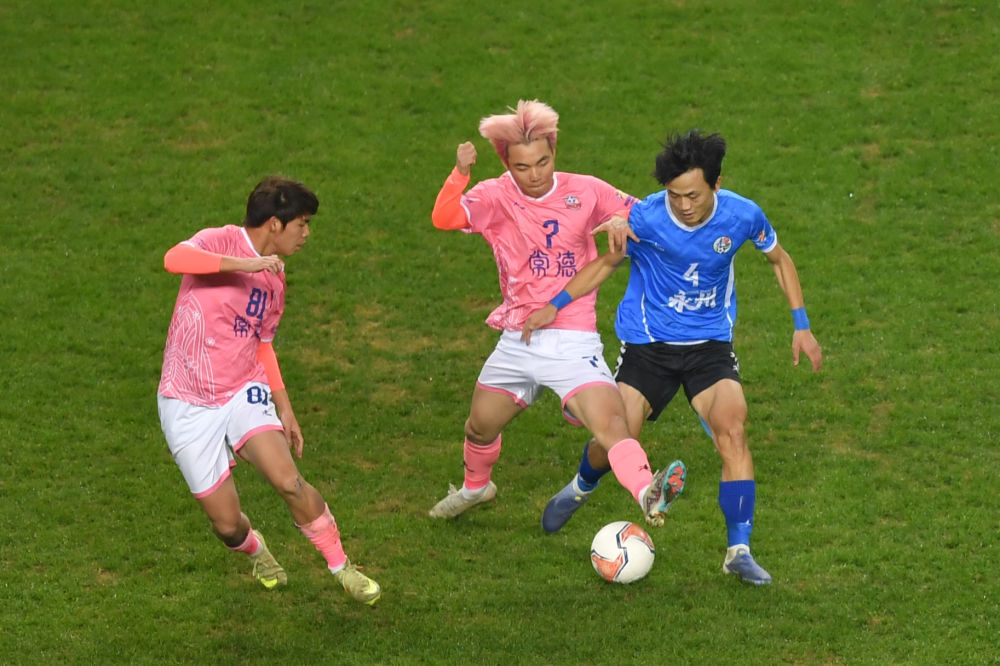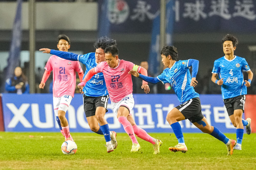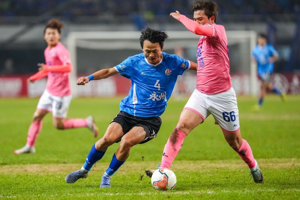 ↑ 永州队球员谷文杰(左)在比赛中射门。 新华社记者 陈思汗 摄
