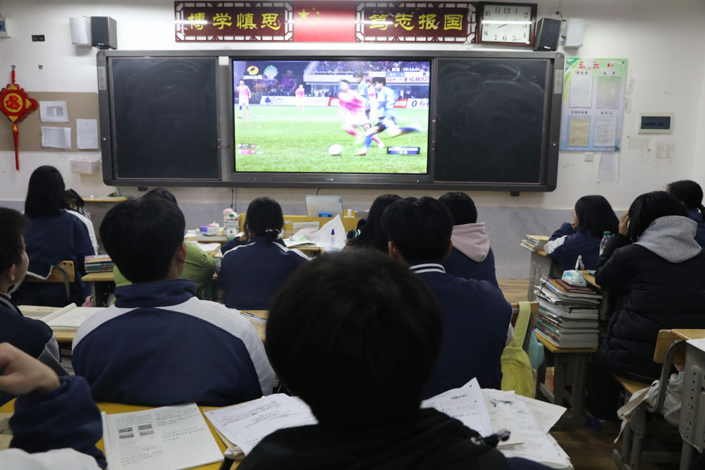 ↑ 学生在湖南永州道县敦颐高级中学教室里观看比赛直播。 新华社发(何红福摄)