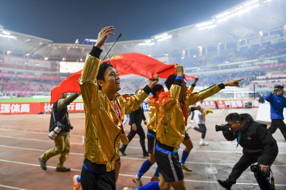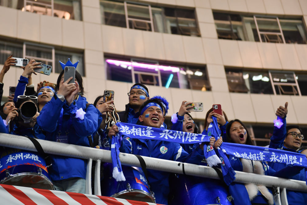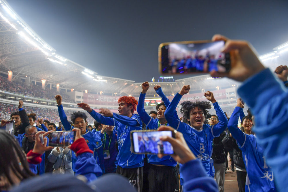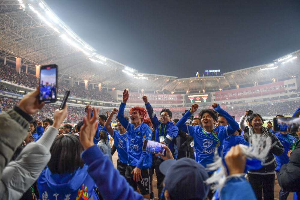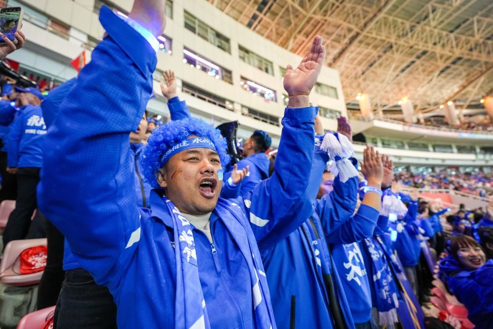 ↑ 永州队球迷(中)庆祝球队夺冠。 新华社记者 陈思汗 摄