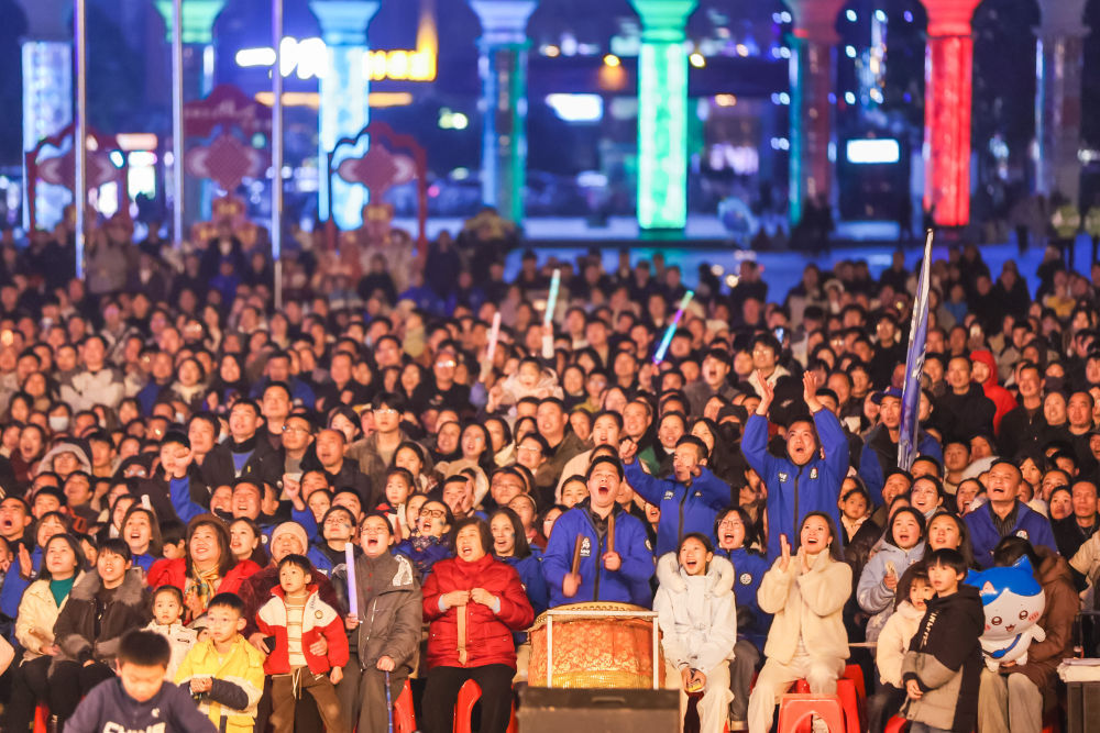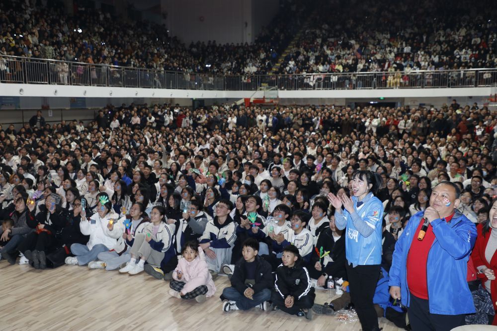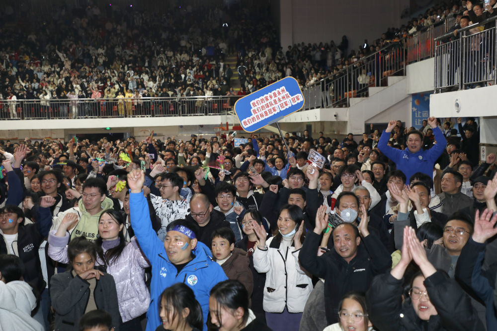 ↑ 球迷在常德桃源县文体中心下沉篮球场观看比赛直播。 新华社发(滕胜男 摄)
