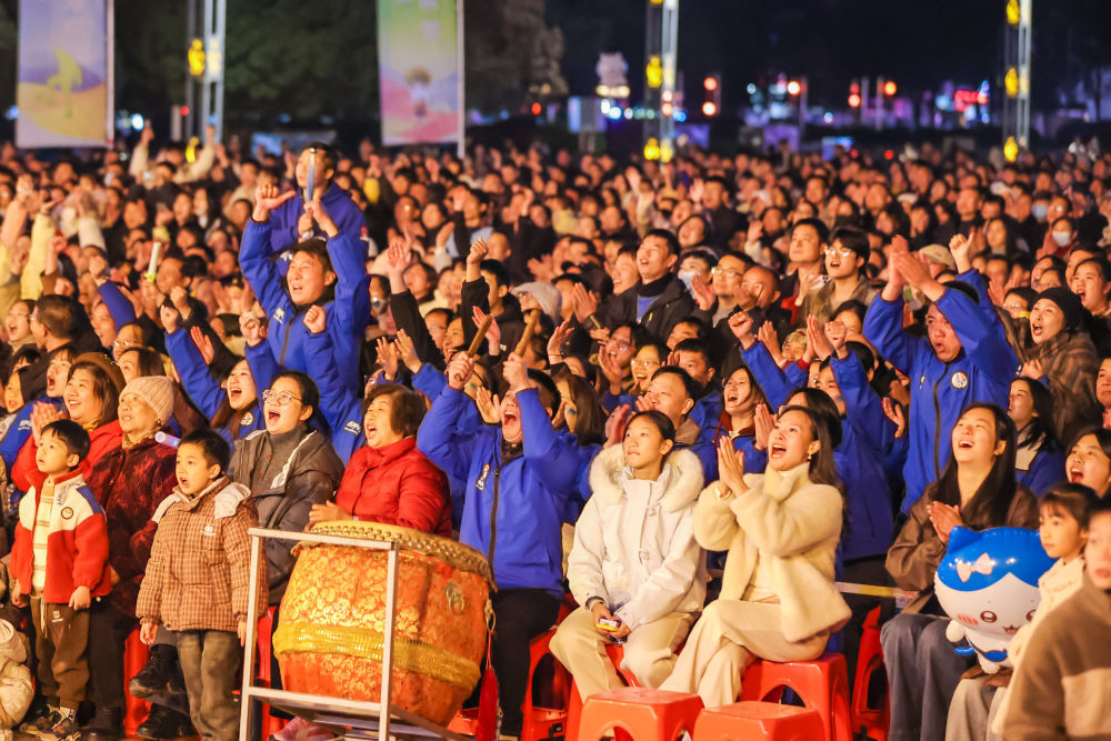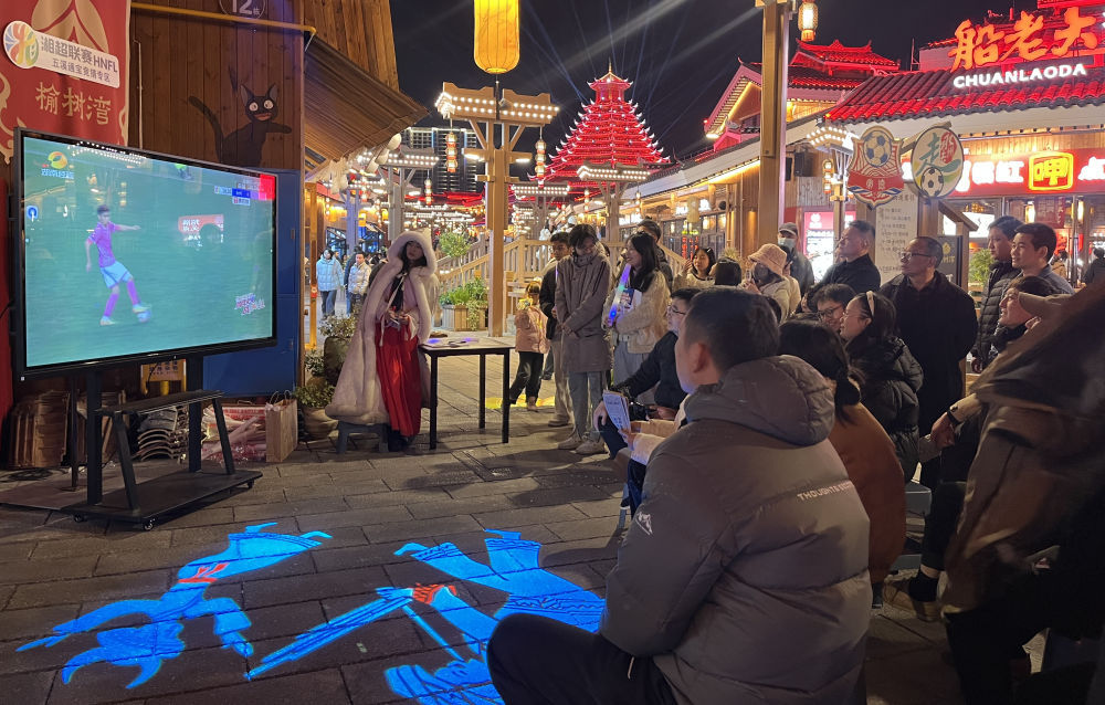 ↑ 球迷在湖南怀化鹤城区一处文旅景区观看比赛直播。 新华社发(张卓摄)
