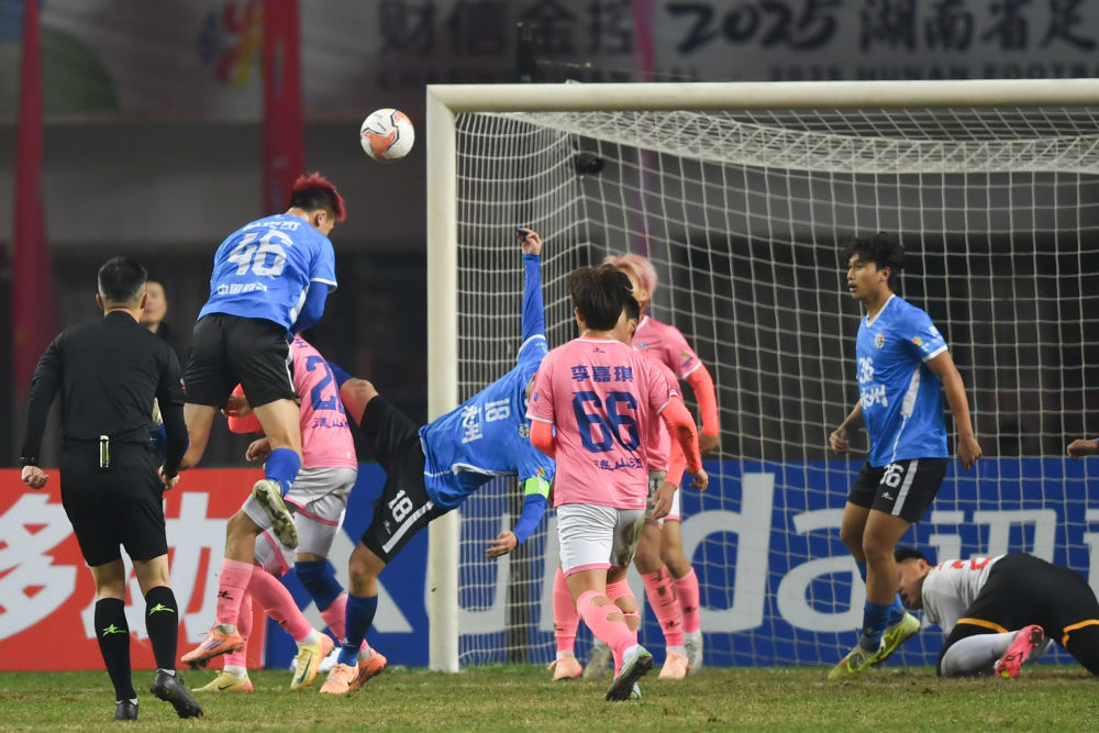 ↑ 永州队球员谷文杰(前左二)在比赛中头球破门得分。 新华社记者 陈振海 摄