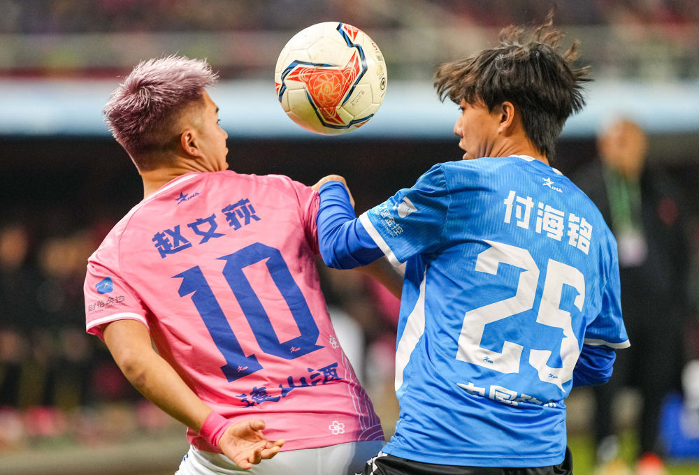 ↑ 常德队球员赵文荻(左)与永州队球员付海铭在比赛中拼抢。 新华社记者 陈思汗 摄