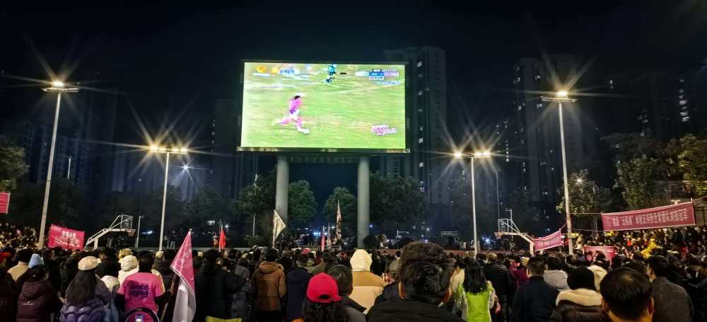 ↑ 球迷在湖南永州蓝山县三蓝广场观看比赛直播。 新华社发(彭华摄)