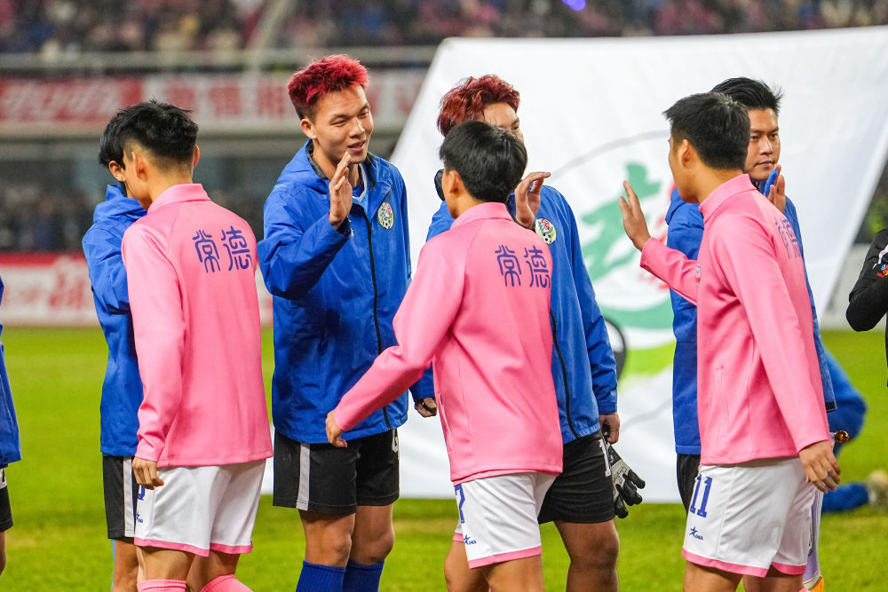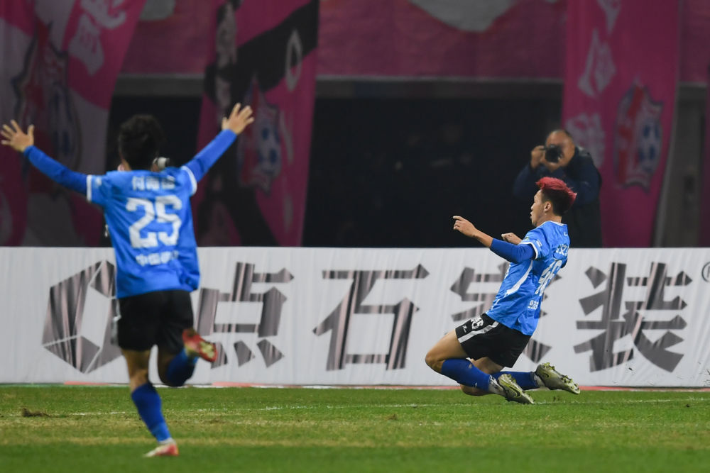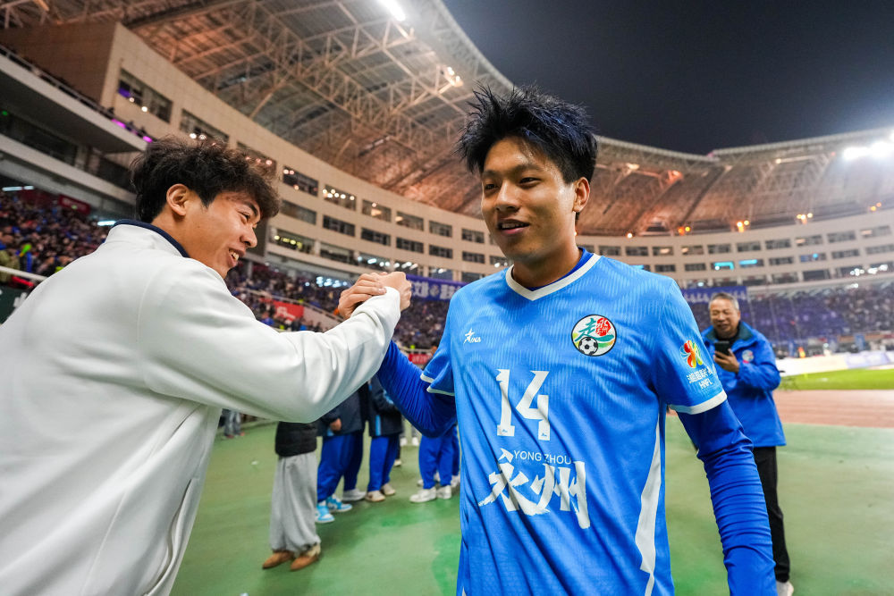↑ 永州队球员谷文杰(右)在破门得分后庆祝。 新华社记者 陈振海 摄