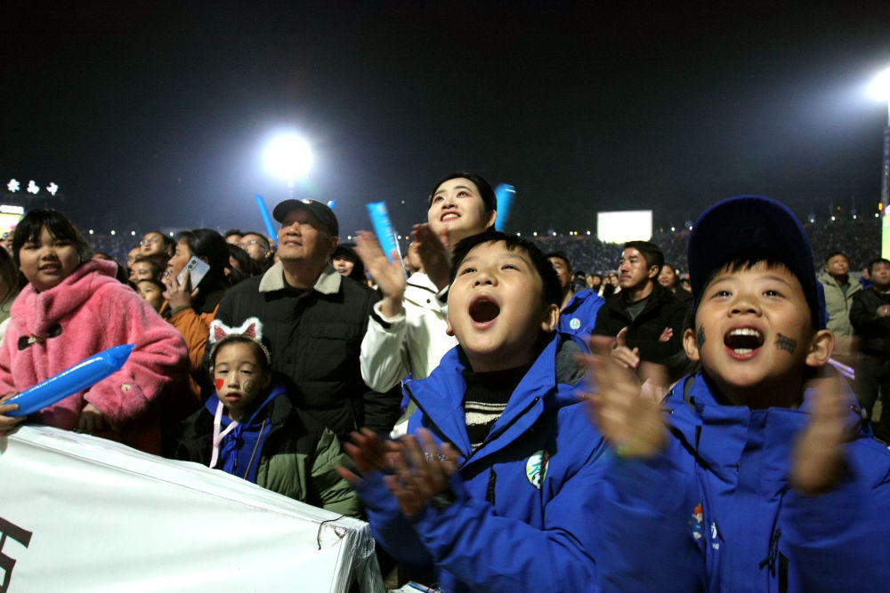 ↑ 球迷在湖南永州市体育场观看比赛直播。 新华社发(胡荣华摄)