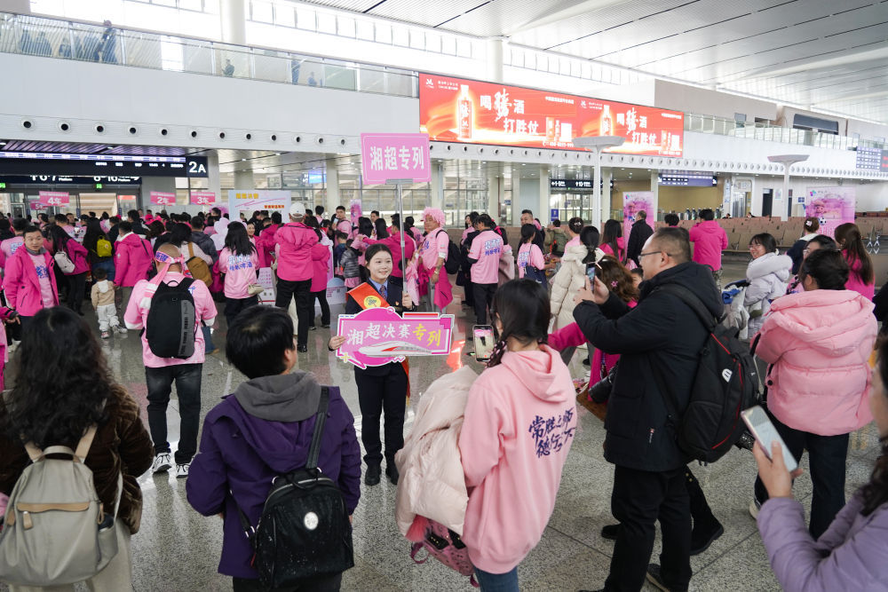 ↑ 在常德火车站“湘超”专列候车区,1000余名常德球迷出发观赛。 新华社发(李悦 摄)