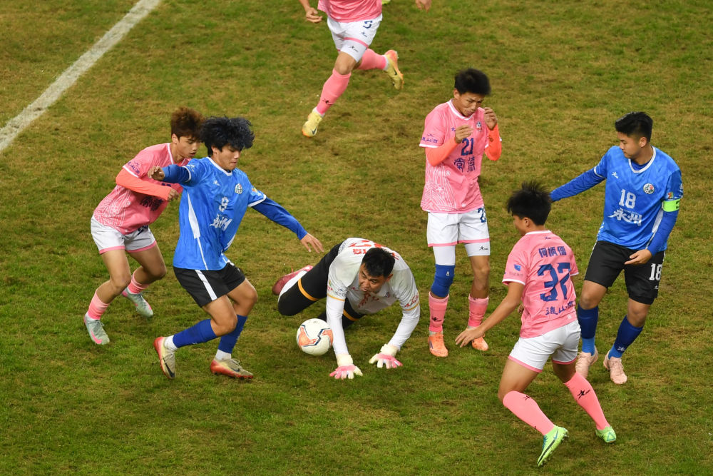 ↑ 常德队守门员王峰琦(左三)在比赛中扑救。 新华社记者 陈振海 摄