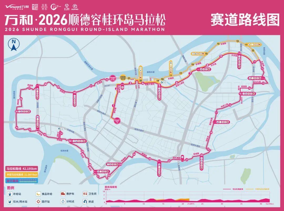 全马路线:海骏达城(起点)-桂洲大道中(逆行)-振华路-凤祥南路-容奇大中-桥西路-桥东路-容奇大道东-外环路-东堤路-新宝东路-外环路-育英路-朝光路-科苑横五路-科苑三路-朝桂南路-华发路-桂洲大道东-南堤路-民乐南路-南堤路-容桂大道南-西堤路-华基路-华基路(折返)-华基路-西堤路-长堤路-滨河路-渔人码头(终点)