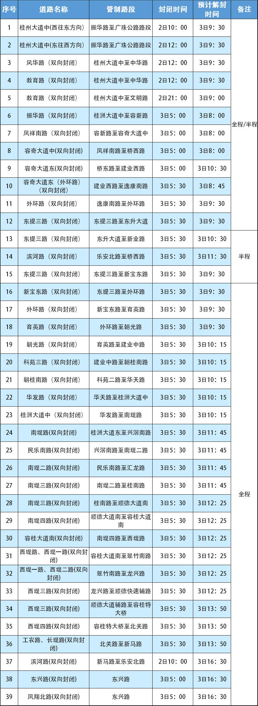 (1)1月2日10:00起,封闭桂洲大道中(振华路至顺德大道)西往东方向车道;12:00起,封闭桂洲大道中(振华路至顺德大道)东往西方向车道,进行起点拱门搭建、舞台等赛前设施施工,其间禁止社会车辆通行及停放;1月3日赛事起跑结束及拆除相关设施后,预计9:30解封。