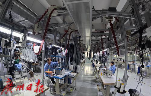 在创兴集团生产车间,智能吊挂系统将裁好的牛仔布片自动流转至下一工序。