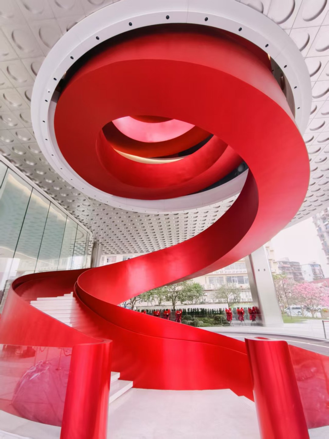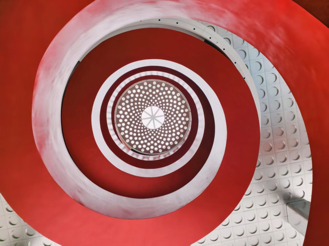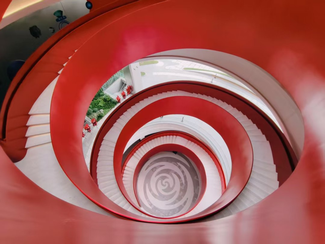 建筑内部的红色旋转楼梯,成为这一设计理念的视觉焦点。该楼梯采用全钢结构,总高达31.342米,总长度186.315米,以最大8米的无支撑悬挑,如一条红色绸带蜿蜒而上,串联起建筑的多个空间,成功创下“无支撑旋转楼梯的单段最大高度”吉尼斯世界纪录。