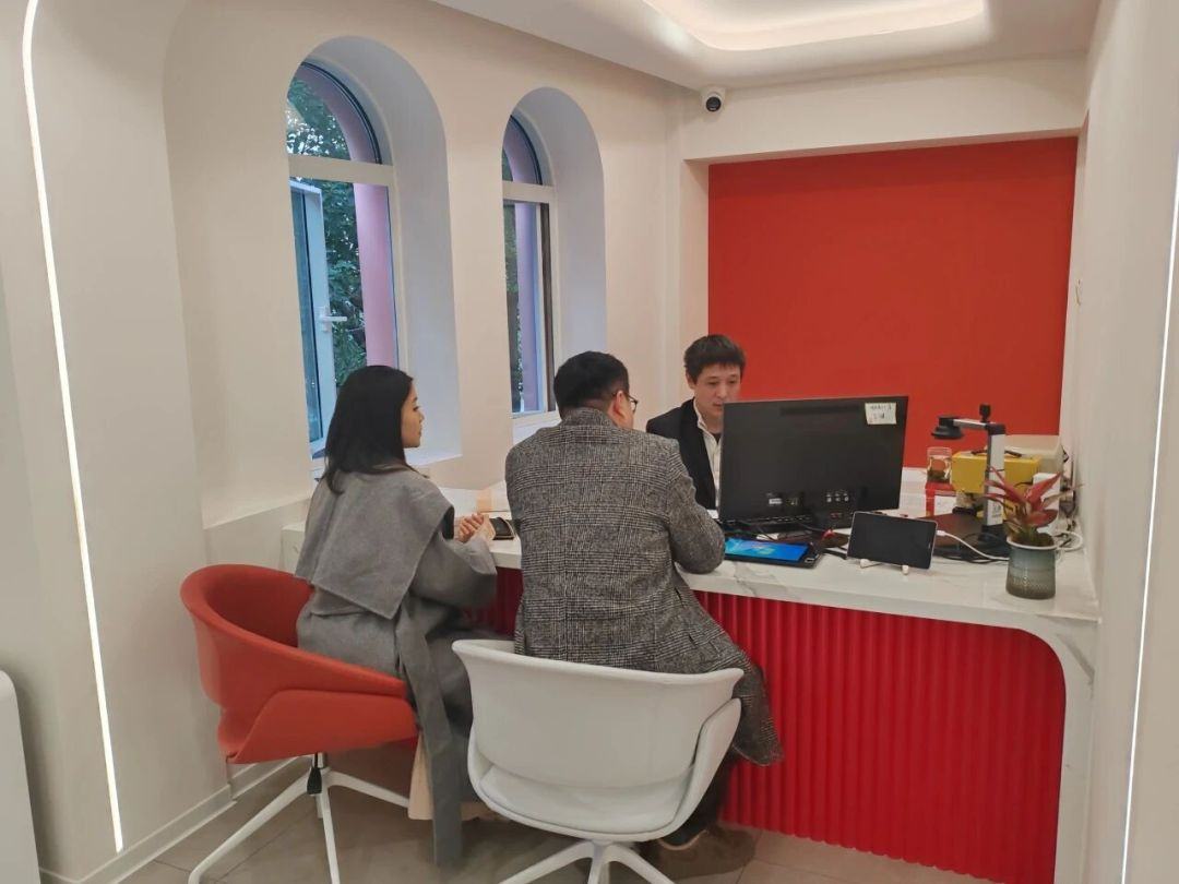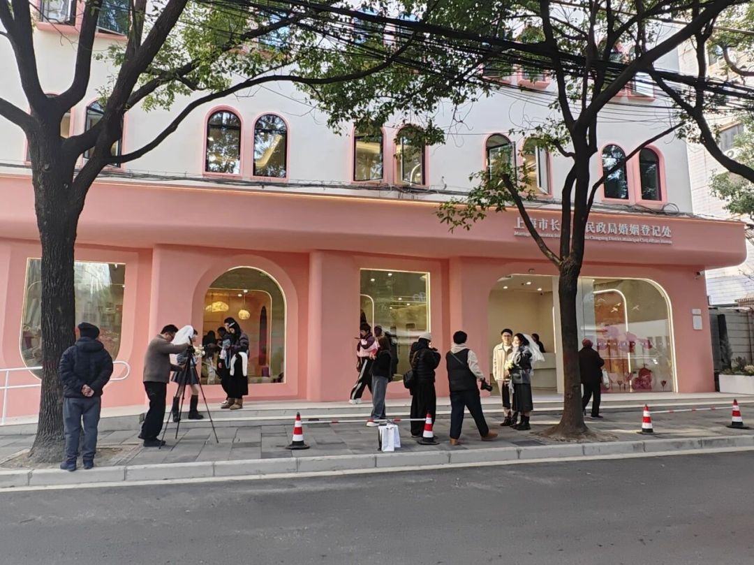 原来,这里曾是一栋普通的老办公楼。经过一年多的改造,如今变身浪漫的“小粉楼”:定制秋千让新人可以在领证日轻松出片,古今“喜”字拼成的长宁会标藏着巧思,就连外墙上的窗户都设计成“成双成对”的模样。
