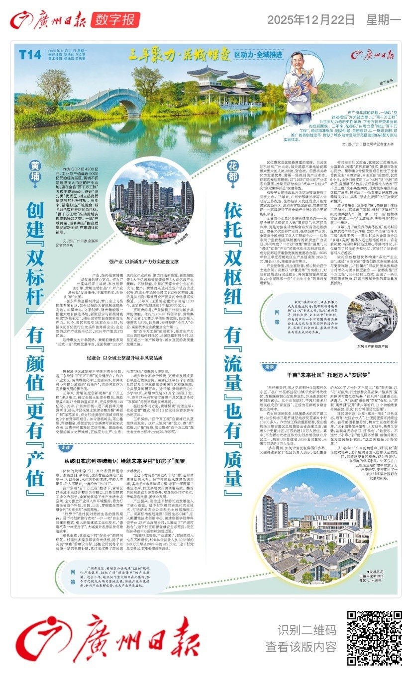 作为GDP超4300亿元、工业总产值逼近9000亿元的经济强区,黄埔不仅是粤港澳大湾区的产业高地,更在全省“百千万工程”考核中脱颖而出,获评“创先类”优秀区,树立起高质量发展的标杆样板。三年来,锚定打造产城融合、城乡融合双标杆区的总目标,“百千万工程”推动黄埔实现脱胎换骨之变。一幅“产城共荣、城乡共美”的高质量发展新图景,在黄埔徐徐铺展。