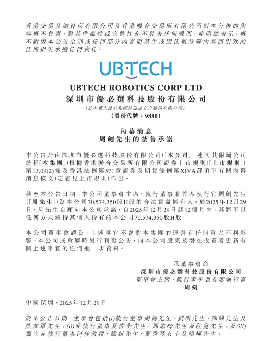 12月29日,“人形机器人第一股”优必选(9880.HK)发布公告,公司创始人、董事会主席兼CEO周剑承诺自2025年12月29日起的12个月内,不会以任何形式减持其个人持有的优必选7057.435万H股。这是周剑第二次发布自愿禁售承诺,体现了管理层对于公司及行业未来发展前景的坚定信心。