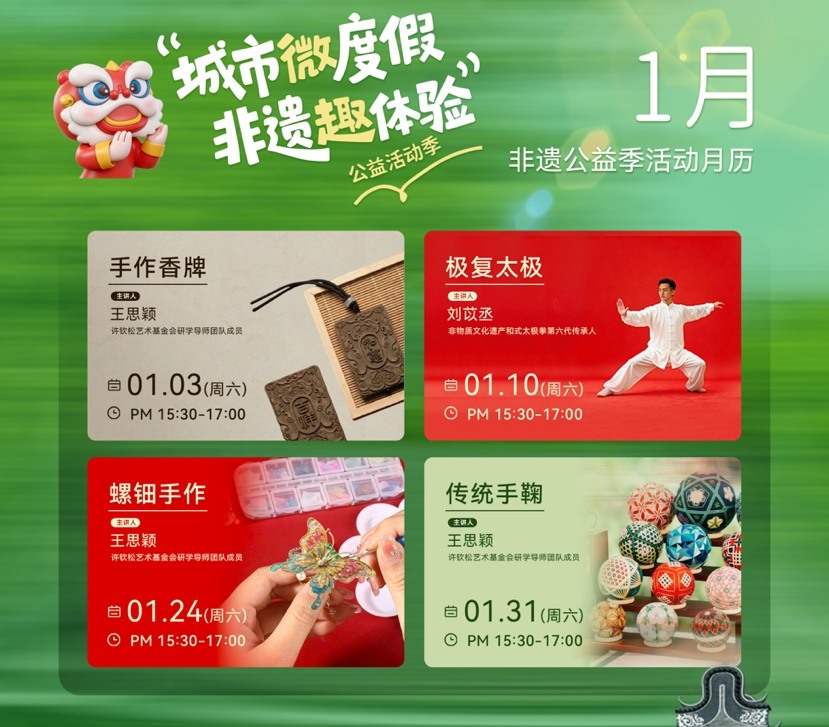 与此同时,园区“公益非遗季”已于2025年12月正式启动,并将持续至2026年2月。每周一期的非遗体验工坊轮番上线,涵盖手作香牌、太极、螺钿、手鞠等多元项目,由非遗代表性项目传承人与资深讲师现场授课。在这里,文化不再是展柜里的陈列,而是指尖可触、身心可感的生活美学。