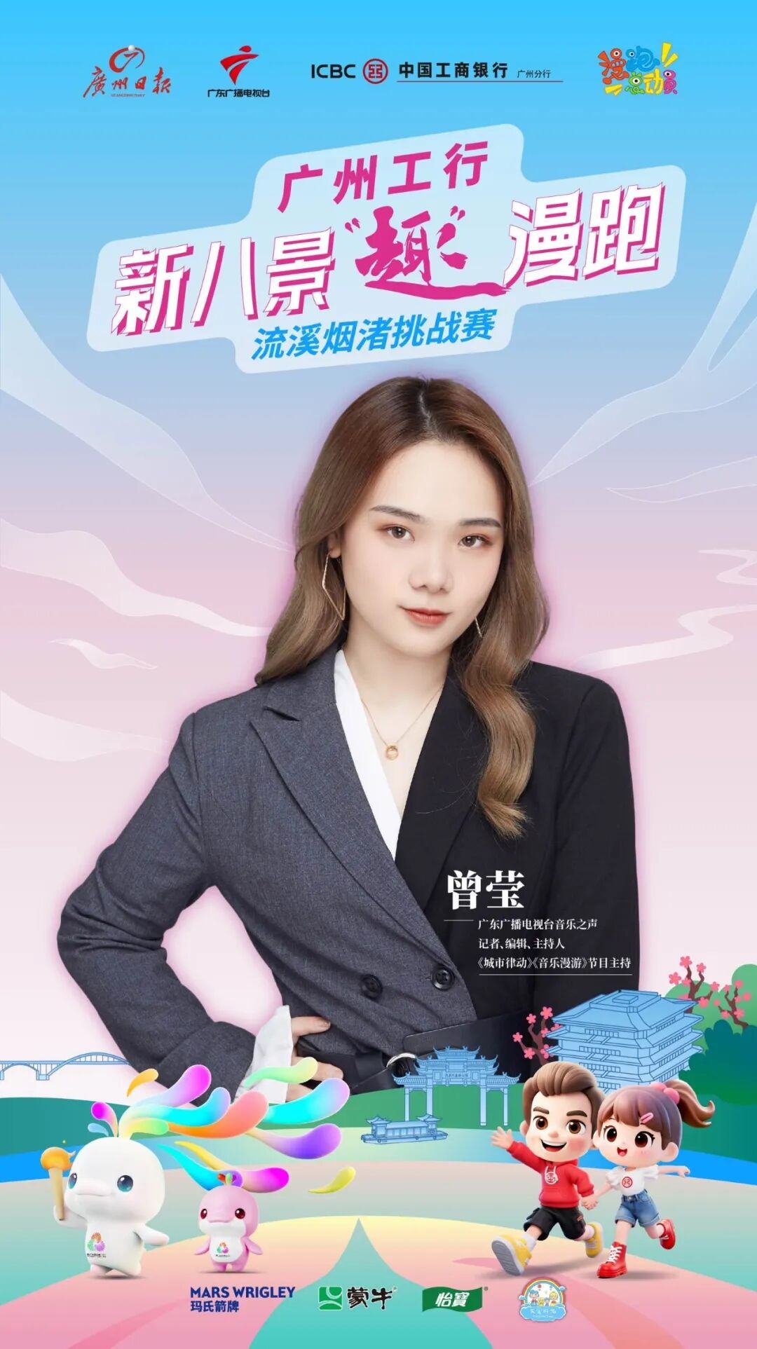 曾莹,广东广播电视台音乐之声《城市律动》《音乐漫游》节目主持人,既是记录城市声音的“生活观察家”,也是用脚步丈量美好的“运动生活家”。她以“在奔跑中阅读城市,在行走里感知温度”为理念,将每一次探索都化为连接生活与自然的旅程。这一次,她将从熟悉的街巷跑向开阔的流溪河畔,以细腻的感知与饱满的热情,带领大家迎清风、沿碧水,在奔跑的节奏中,共同发现广州灵动而舒展的生命脉络。