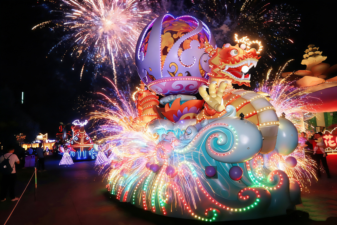 更引人注目的是,园区将焰火演绎从空中延伸至地面与水面。重磅回归的“焰火花车大巡游”化身移动的焰火舞台,智能焰火随花车行进绽放,与荧光舞者交织出梦幻光景。湖面上,非遗打铁花与特技“飞天火壶”首次同台,火星坠湖、火瀑倾泻,形成水陆空交织的立体火舞奇观。