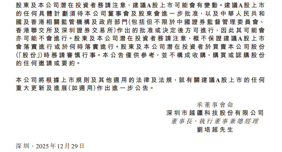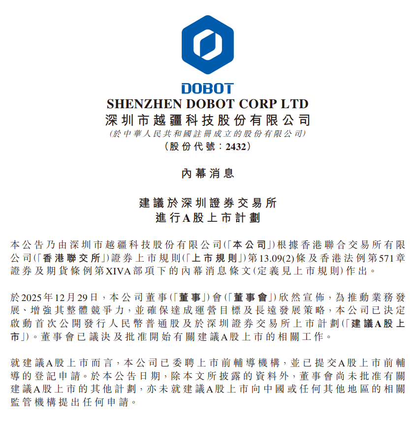 公告称,就建议A股上市而言,越疆科技已委聘上市前辅导机构并提交辅导登记申请,并已提交A股上市前辅导的登记申请。截至公告发布日,公司董事会已决议和批准相关筹备工作,但除所披露的资料外,尚未批准有关建议A股上市的其他计划,亦未就建议A股上市向境内外相关监管机构提出任何申请。