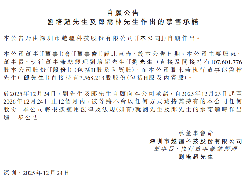 面对解禁带来的市场关切,越疆科技管理层迅速释放信心信号。12月24日,公司发布公告称,主要股东、董事长兼总经理刘培超直接及间接持有1.08亿股公司股份(含H股及内资股),股东兼执行董事郎需林直接持有756.82万股股份(含H股及内资股),二人自愿承诺自2025年12月25日起至2026年12月24日止,12个月内不减持所持有的任何公司股份。