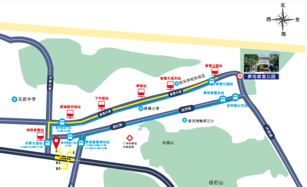 P1:萝岗香雪公园正门停车场(可提供停车泊位633个)