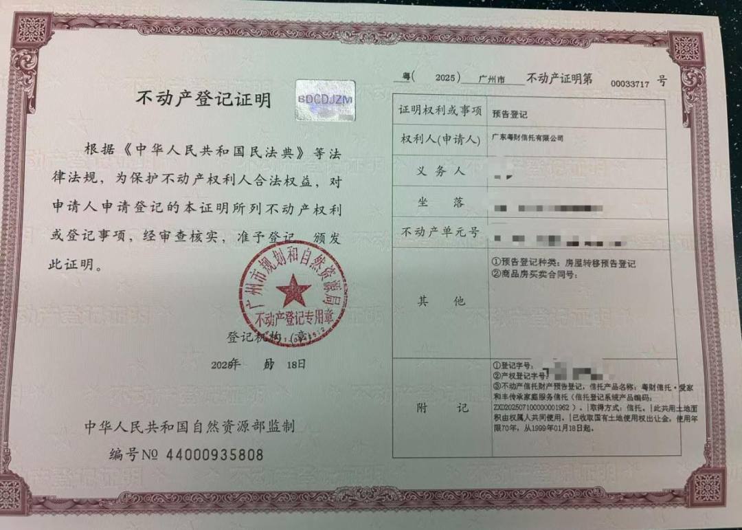 7月18日,全国首张不动产信托预告登记证明在广州诞生。针对不动产信托设立时常见的不动产暂未满足转移登记条件不能办证的实践难题,不动产信托财产预告登记在羊城率先“解锁”。一句“先行先试”,信托机构再也不用等“过户条件成熟”才能锁定物权,预告登记先把风险关在门外,让存量资产瞬间拥有保障屏。同时,试点政策不仅适用于广东辖内信托机构在穗业务,更惠及在广州设有异地部门的全国性信托公司,突破了地域和机构限制,为金融活水涌向实体经济提供了强大助力。