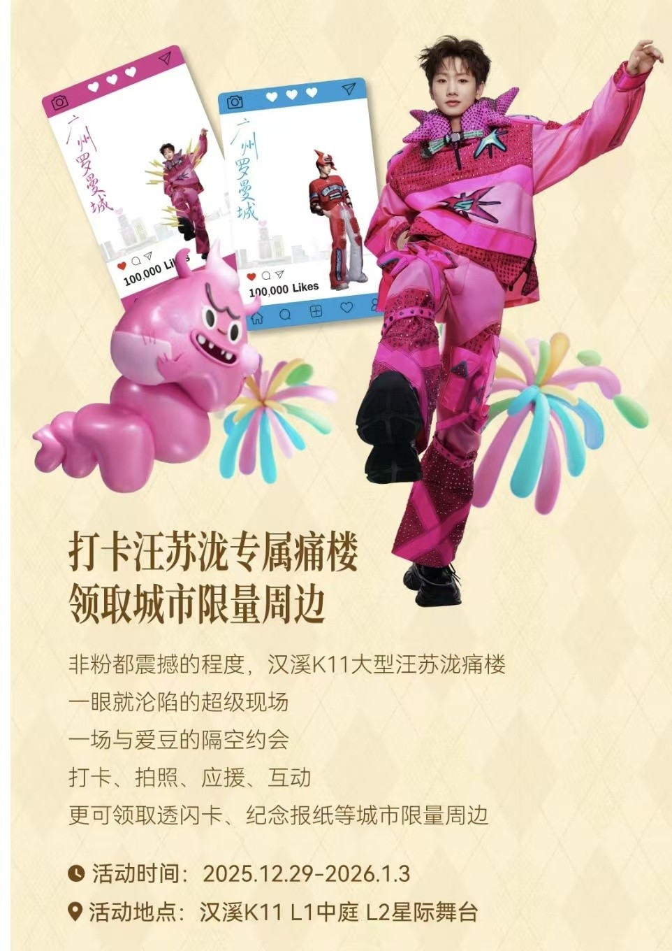 元旦期间,广州汉溪K11购物艺术中心延续“兴起一番乐趣”为主题的艺趣冬日主题活动,于2025年12月31日至2026年1月3日期间,携手广美艺术工作室打造一场有温度的艺术市集,汇聚30+独立品牌与创意内容,用设计、手作、美学与灵感,与顾客共迎浪漫新年。同时,于汪苏泷“十万伏特”巡回演唱会期间,携手QQ音乐特别打造巡回演唱会收官主题装置,在商场二楼的“星际舞台”打造一处沉浸式主题空间,还有限定透卡、签名周边等惊喜好礼。12月31日当晚,同步汪苏泷演唱会的时间节点,还会以一场现场歌友会的形式,与在场顾客及汪苏泷粉丝用音乐迎接新的一年。