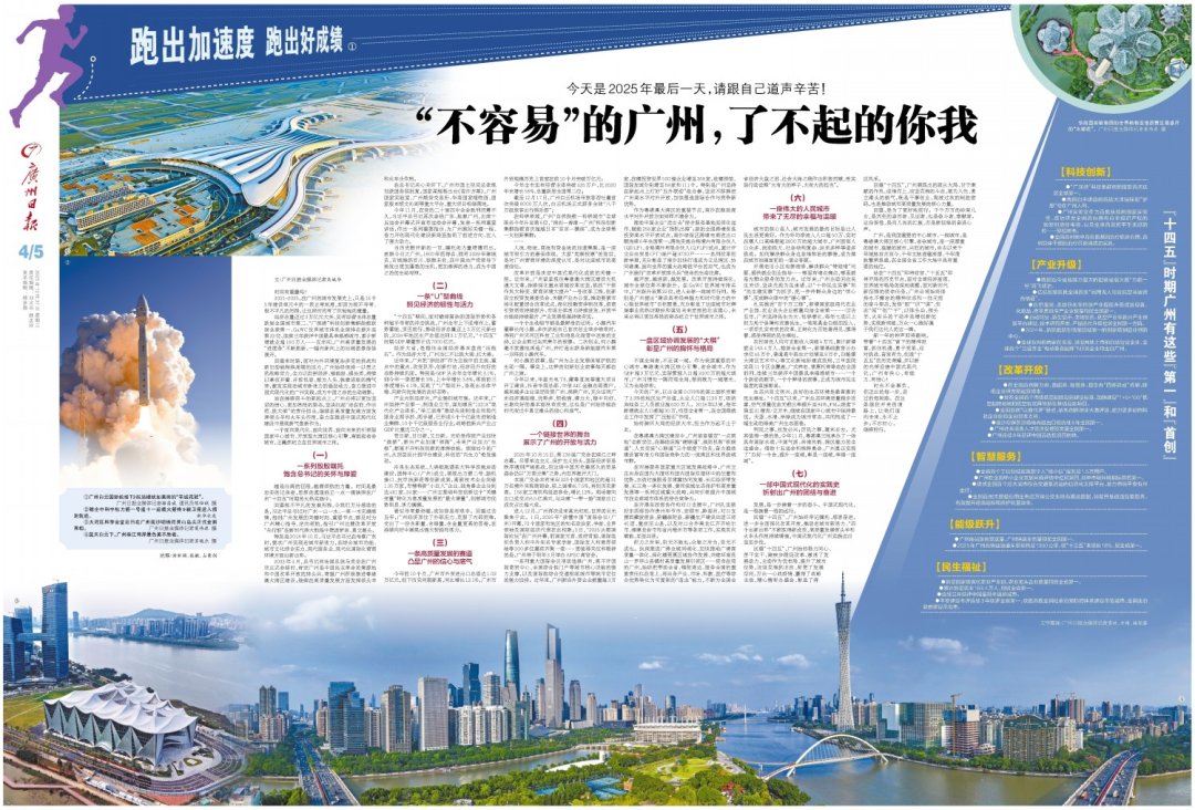 经济总量迈过3万亿元大关、实有经营主体总量跃居全国城市第二、“广深港”科技创新集群指数跃居全球第一、GaWC世界城市体系全球排名提升至第22位、连续三年获评中国最具幸福感城市、累计新增就业超160万人……五年间,广州高质量发展的“进度条”不断刷新,一幅向新向上的壮阔图景徐徐展开。