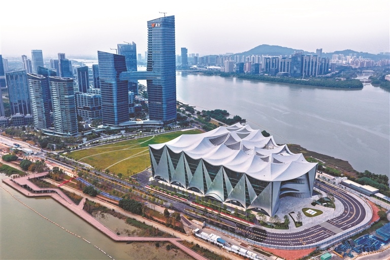 大湾区科学会堂近日在广州南沙明珠湾灵山岛尖正式全面亮相。