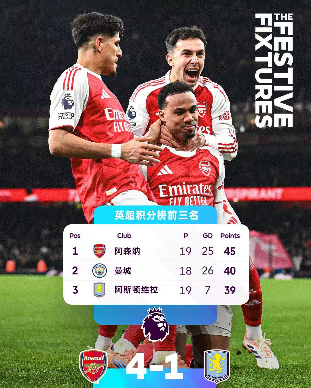 北京时间2025年12月31日凌晨,2025—2026赛季英超联赛展开了第19轮的争夺,阿森纳主场以4比1大胜阿斯顿维拉,终结对手11连胜的同时,“枪手”也以5分领先少赛1轮的曼城,夺得本赛季英超的半程冠军。