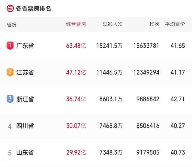 【2025年全国电影票房超518亿元,广东连续24年蝉联“第一票仓”】据统计,广东省2025年总票房为63.48亿元,观影人次超1.52亿,放映场次超1563万,以超12%的票房占比,连续24年蝉联全国“第一票仓”,总观影人次及放映场次均为全国第一。详情>>>