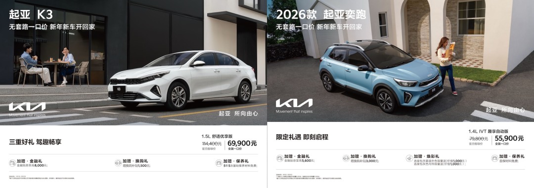 2026年1月1日,悦达起亚宣布针对起亚K3和2026款起亚奕跑推出全国一口价。消费者在任意悦达起亚授权经销商门店购车,均可享受全国统一的价格与品质服务,不分区域,也不用议价、没有套路。