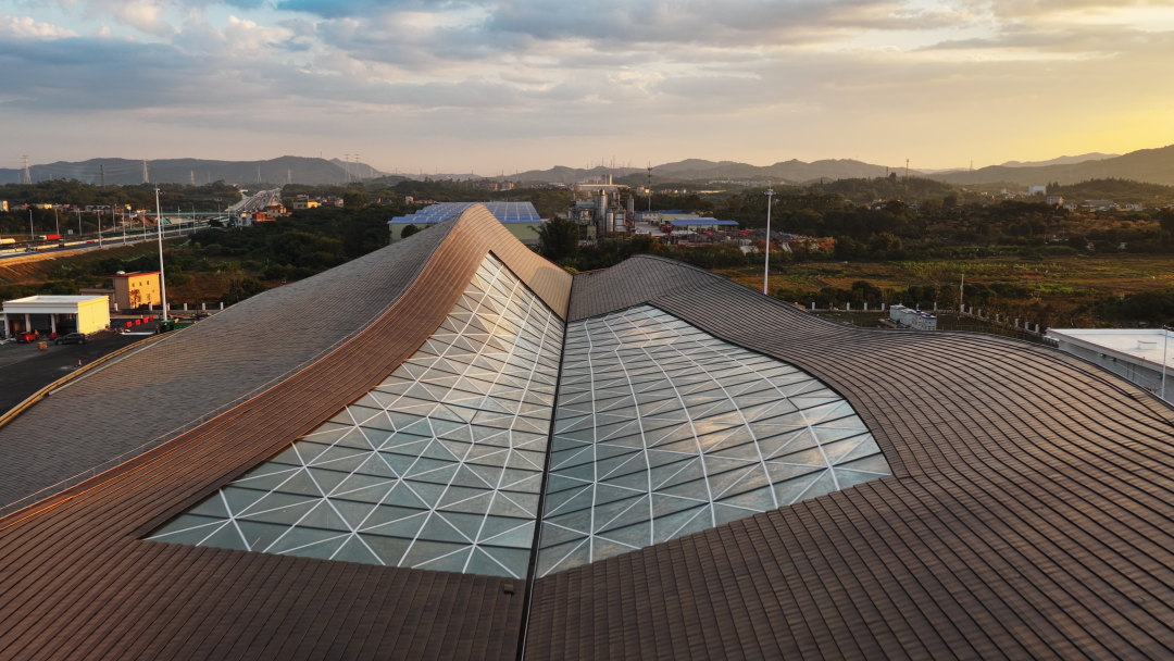 服务区玻璃天棚和陶土瓦屋顶光影交错。