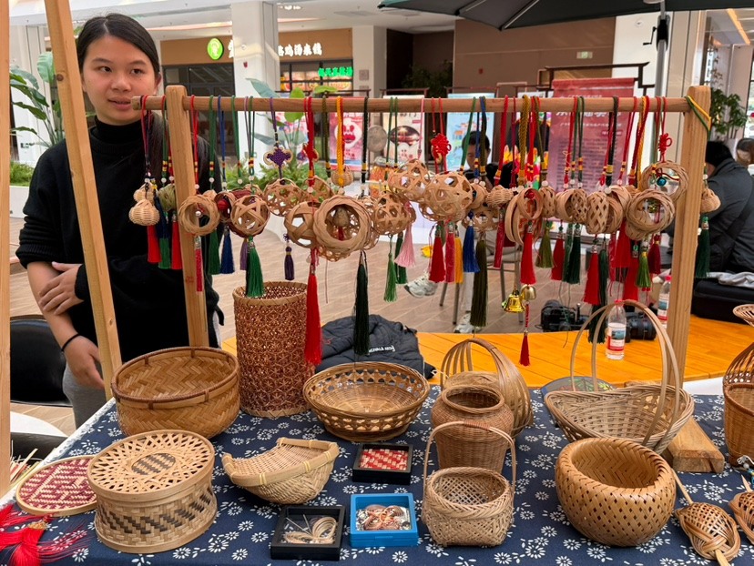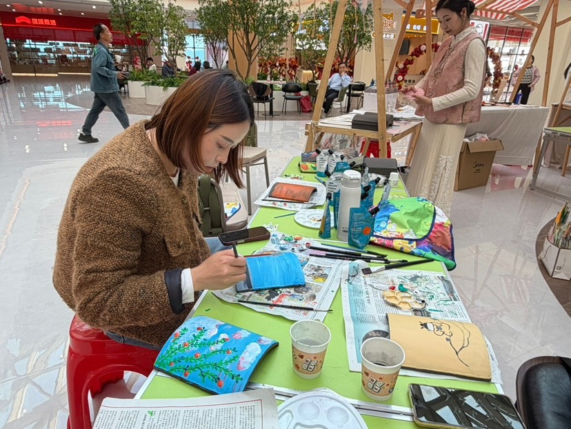 旅客在非遗体验区前体验拓印、竹编等。
