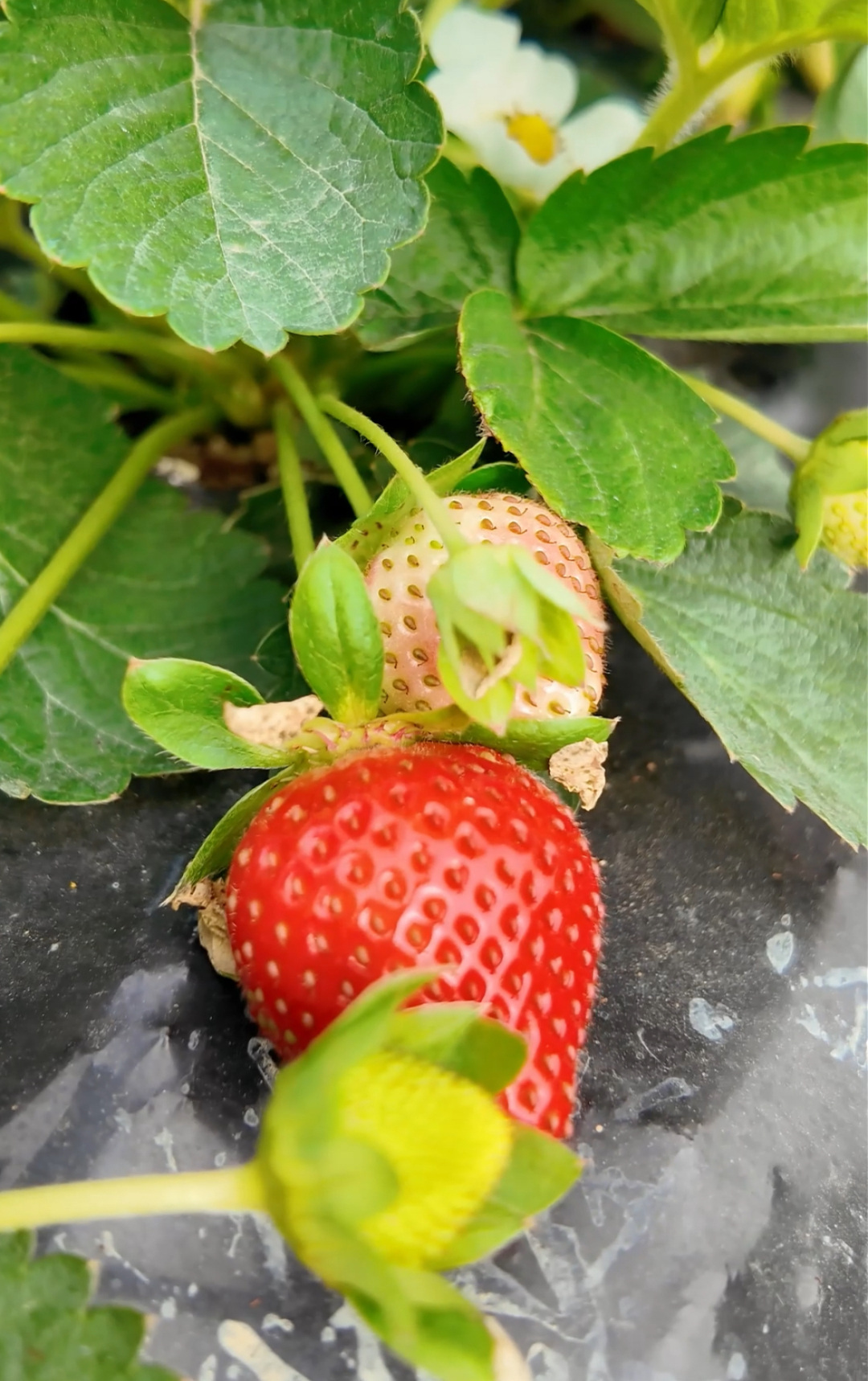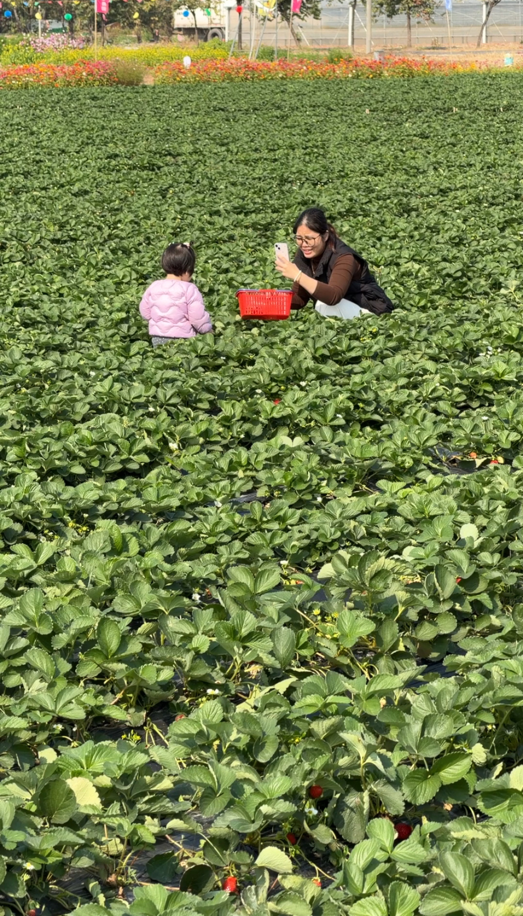 “要挑红透的、个头大的!”一位爸爸边说边帮孩子拨开叶子,三岁的小男孩小心翼翼地摘下一颗比拇指还大的奶油草莓,放进小篮子里。多数游客以亲子家庭为主,大人带着孩子一边摘一边认品种,场面其乐融融。
