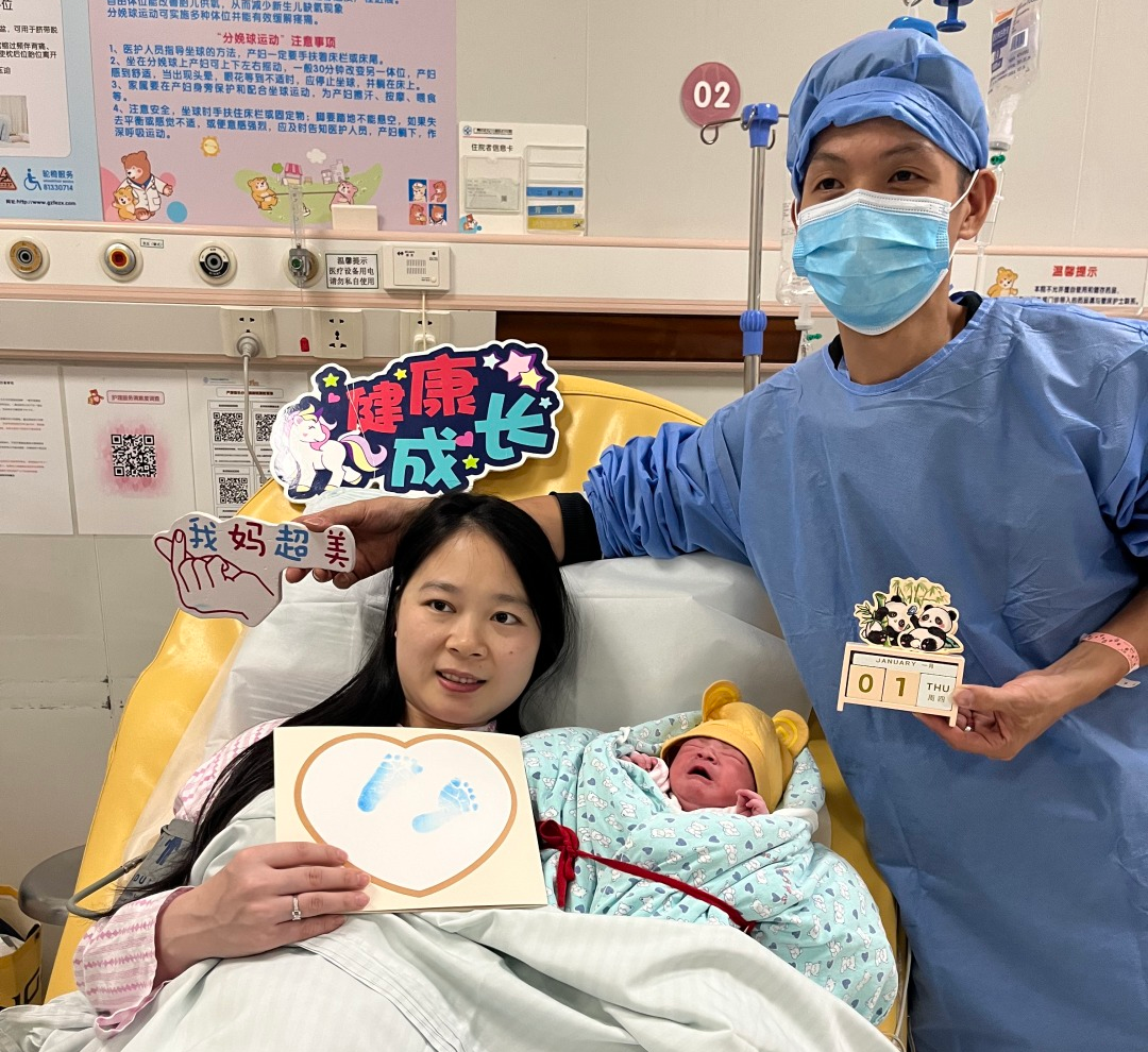 早上10时许,在广州市妇儿中心珠江新城院区,“元旦宝宝”乐乐(化名)呱呱坠地。宝爸李先生(化姓)难掩激动,拿起手机拍下一家三口全家福。