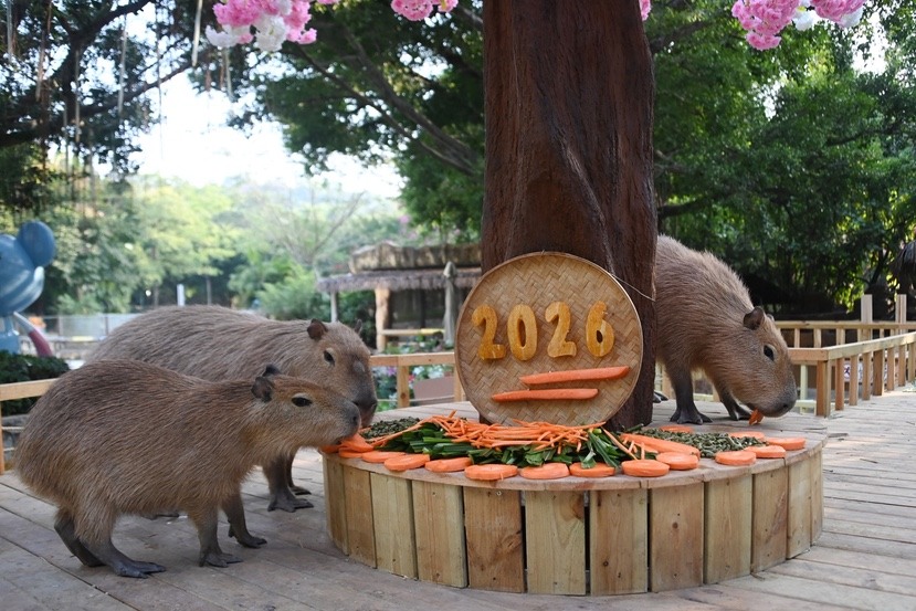 2026年元旦,深圳野生动物园饲养员特意为园内动物准备了丰盛的“2026新年美食”,仪式感拉满。采用多种食物,合理搭配,摆盘新颖,动物们对营养丰富的“2026新年第一餐”满盈好奇,大快朵颐。