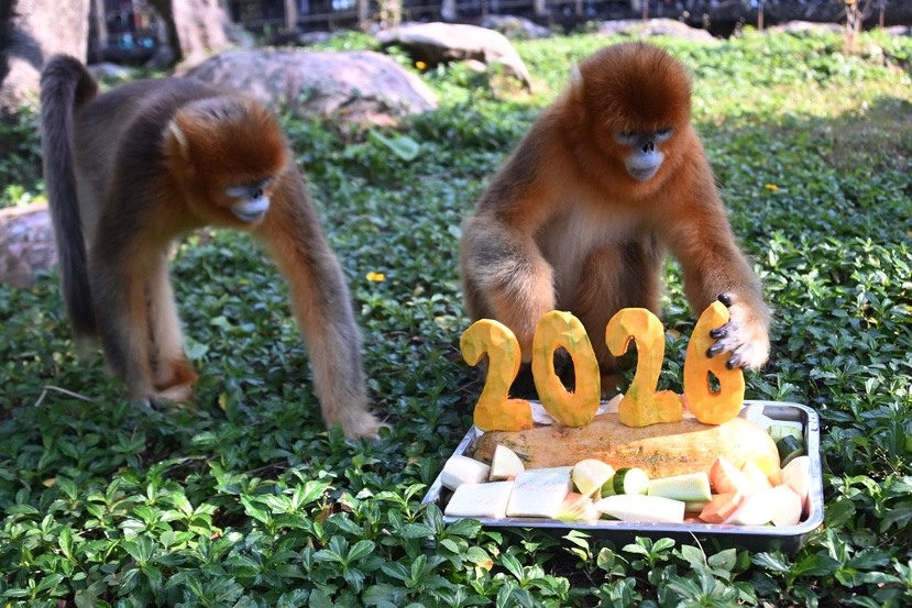 金丝猴岛里,还未等饲养员把“美食拼盘”放下来,金丝猴纷纷从树上跳下来,它们对新奇的食物摆盘充满好奇,和睦地围坐在一起,不争也不闹,各自抓起喜欢吃的食物,一起乐享“2026新年美食”。