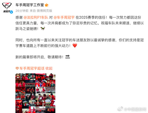 随后周冠宇工作室发文回应:感谢法拉利F1车队对周冠宇在2025赛季的信任!每一次努力都因这份信任更具力量,每一次并肩都成为了弥足珍贵的记忆。祝福车队未来顺遂,继续以跃马之姿驰骋!同时,也向所有一直以来关注冠宇的车迷朋友致以最诚挚的感谢,你们的支持是冠宇赛车道路上不断前行的强大动力!新的篇章即将开启,敬请期待!