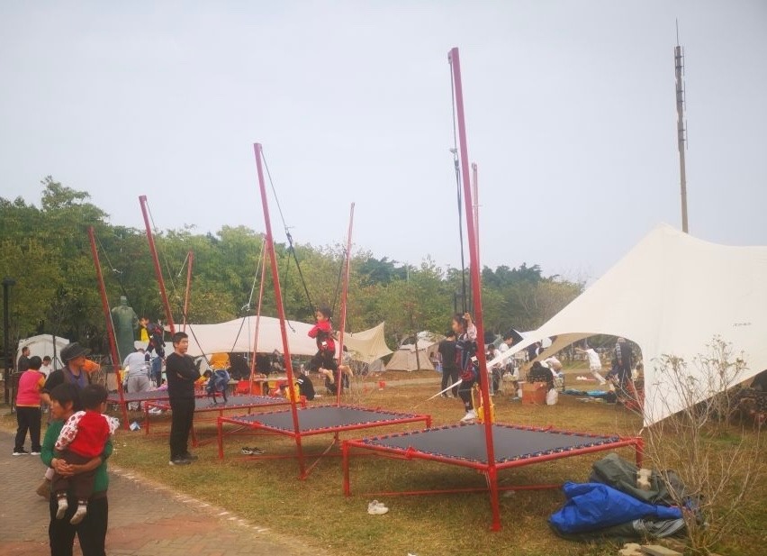 记者在梁明诚雕塑园看到,像左小姐这样自带帐篷来梁明诚雕塑园露营赏江景的市民不少,只见一顶顶帐篷临江而立,江岸景色如画,江中波光粼粼。露营的市民,有的在品尝美食,有的在玩牌娱乐,有的在畅谈人生,有的在发萌拍照,有的在欣赏江景。有市民在帐篷上挂起了新年快乐的祝福语,格外醒目;还有商家在草坪上临时搭起了户外充气戏水池、蹦床等游乐设施,吸引了不少亲子家庭参加。