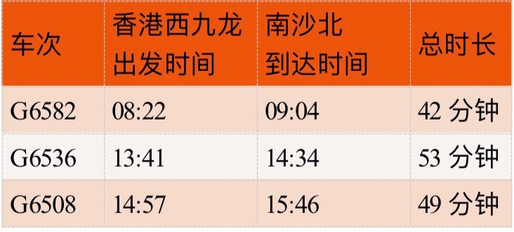 从香港西九龙站出发,搭乘高铁可直达南沙北站,全程最快42分钟。