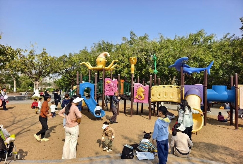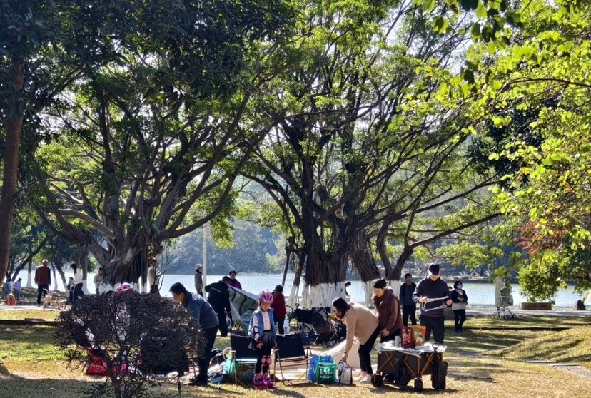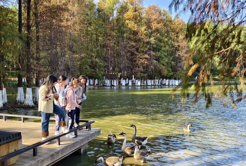 除了迷人的落羽杉,公园持续提升的环境也成为市民假日休闲的热门去处。园区南门主干道两旁国旗飘扬,与往来游客身影相映,节日气氛浓郁;半岛文化广场的亭台中,人们闲坐赏景,沐浴清风;环湖步道旁的树荫下,帐篷与天幕点缀其间,家人朋友相聚畅谈,尽享野趣;在凤山湖岸边,家长带着小朋友投料喂鹅,童声欢笑随湖波荡漾;在可骑行区域,游人悠然穿梭于绿荫之下,车铃与笑语相伴;七盏灯水库堤坝上,亦有游客驻足远眺,感受湖光山色的宁静开阔。