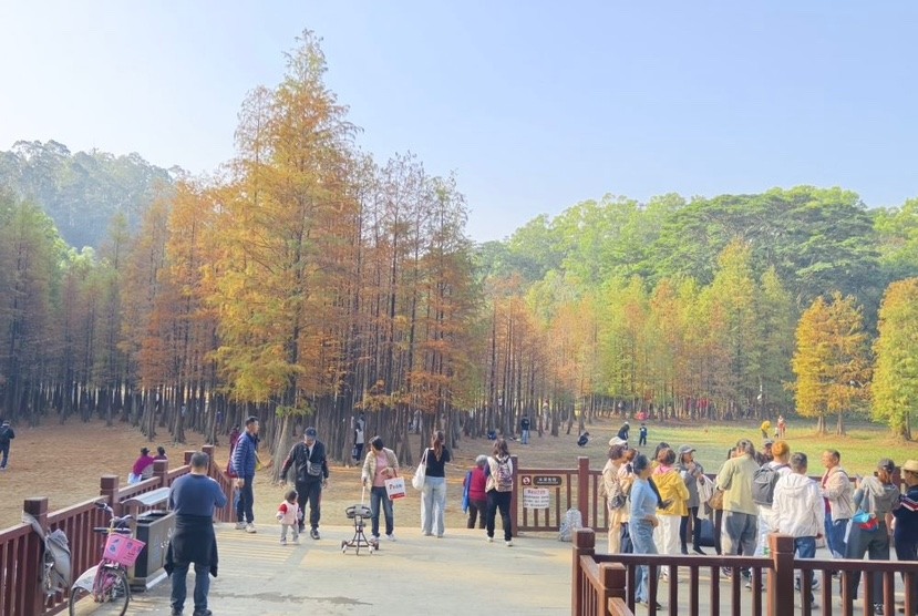 新年伊始,广州番禺大夫山森林公园喜迎“开门红”。元旦假期,园区内万株落羽杉层林尽染,由翠绿渐变为橙红,宛若一幅冬日暖色调的油画,吸引了众多游客前来赏景“打卡”。据统计,仅元旦当日入园游客就达11万人次。